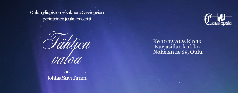 Read MoreEtsitkö itsellesi taiteellista harrastusta? Kaipaako lauluäänesi seuraksensa harmoniaa? Liity joukkoon musikaaliseen ja mukavaan! Oulun yliopiston sekakuoro Cassiopeia hakee riveihinsä uusia