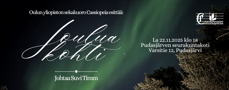 Joulu saapuu sävelin – tule kanssamme nauttimaan joulunajan ensihetkistä! Tänä vuonna Oulun yliopiston sekakuoro Cassiopeia tuo joulun taikaa myös Pudasjärven